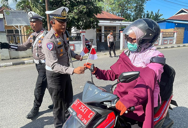Selain pemberian bendera merah putih, para petugas Lalu lintas juga memberikan imbauan ke warga agar selalu tertib berlalu lintas, dan mengutamakan keselamatan saat berkendara.