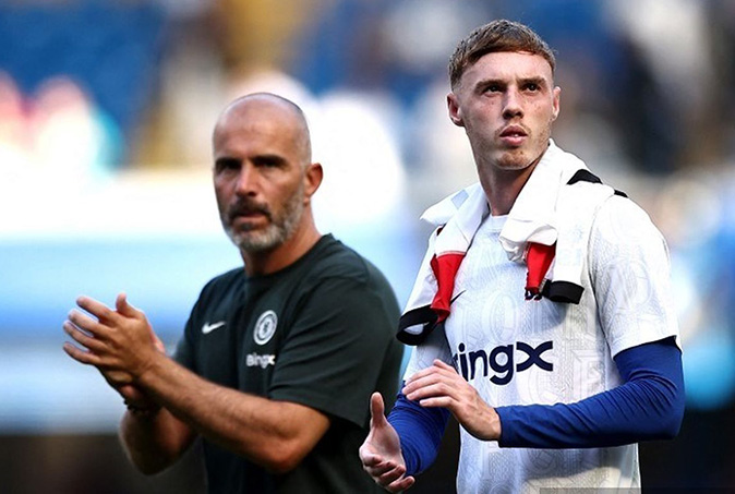 Cole Palmer bersama dengan pelatih Chelsea Enzo Maresca usai laga pramusim melawan AC Milan di Stamford Bridge pada 10 Agustus 2025.(AFP/HENRY NICHOLLS)
