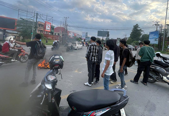 Aksi Komisariat Besar Mahasiswa Universitas Muhammadiyah Kendari (KBM UMK) di kawasan lampu merah Pasar Baru, Kota Kendari, Selasa (3/2/2026).