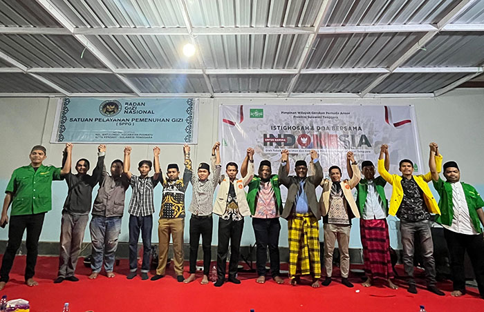 Pimpinan Wilayah (PW) Gerakan Pemuda (GP) Ansor Provinsi Sulawesi Tenggara, tokoh pemuda lintas Iman dan gabungan pimpinan Ormas Sultra menggelar istighosah doa bersama untuk keselamatan bangsa Indonesia, Minggu (31/8/2025).